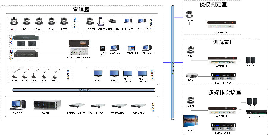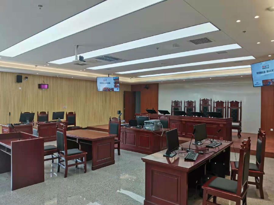 项目包含:1间知识产权审理庭,1间侵权判定室,1间调解室,1间多媒体会议室,使用4台ng28(南宫)科技(AVSYS)多媒体综合管理一体机,实现统一控制管理,音视频调度,会议室互动等应用。