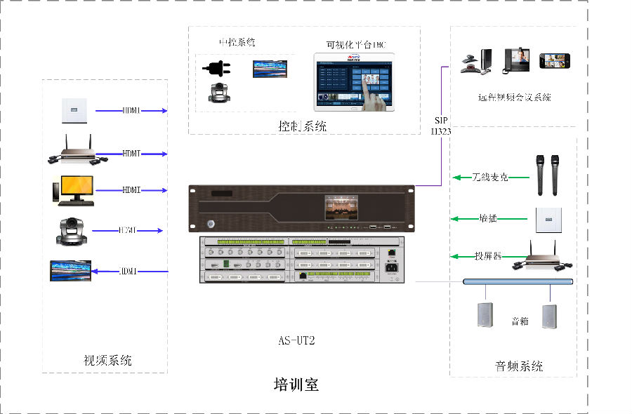 中控、音频、视频一体化可视化应用,部署方便、使用灵活、维护简单。
